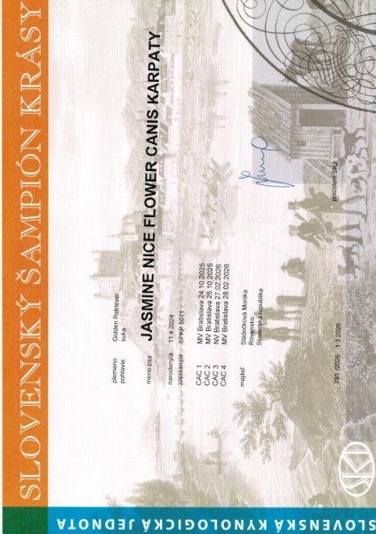 Šampionát s prehľadom získala po zásluhe keďže za víkend bola 3 x ohodnotená CAC, čím prekonala už v 22 dvoch mesiacoch veku počet potrebných čakateľstiev CAC